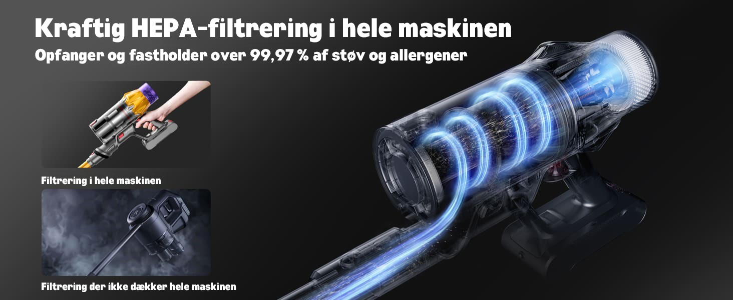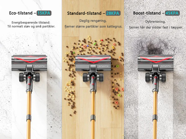 ✔ Kraftig sugestyrke (45 KPA): Fjerner snavs, støv og dyrehår.